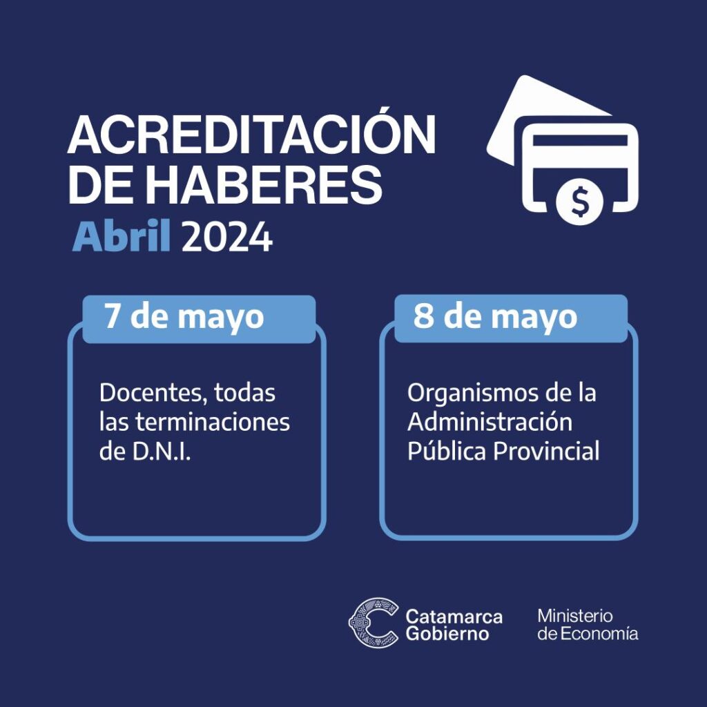 El Ministerio de Economía informa que la acreditación de los haberes del mes de abril de 2024 se hará efectivo según el siguiente cronograma: