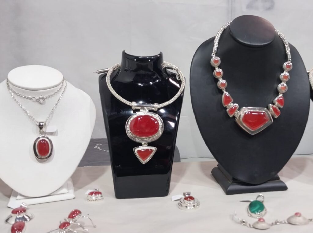 Hace 15 años que Oviedo se dedica a la joyería artesanal y, según contó, se encarga de todo el proceso desde el diseño, la preparación del material hasta la lapidación de piedras, principalmente la rodocrosita. Ha tenido participación en numerosas ferias del país.