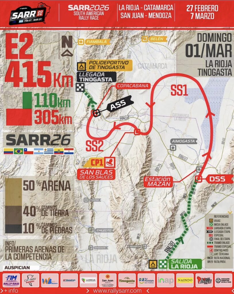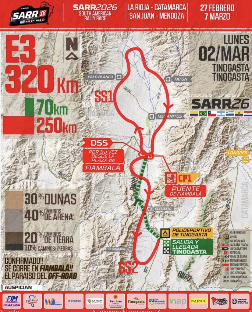 El lunes 2 de marzo se disputará la Etapa 3, netamente catamarqueña, con formato Tinogasta – Tinogasta, teniendo como punto de partida y llegada el Polideportivo local. El recorrido incluirá sectores emblemáticos como las Dunas de Belén, Tinogasta y Fiambalá, completando un total de 320 kilómetros entre enlace y especial.