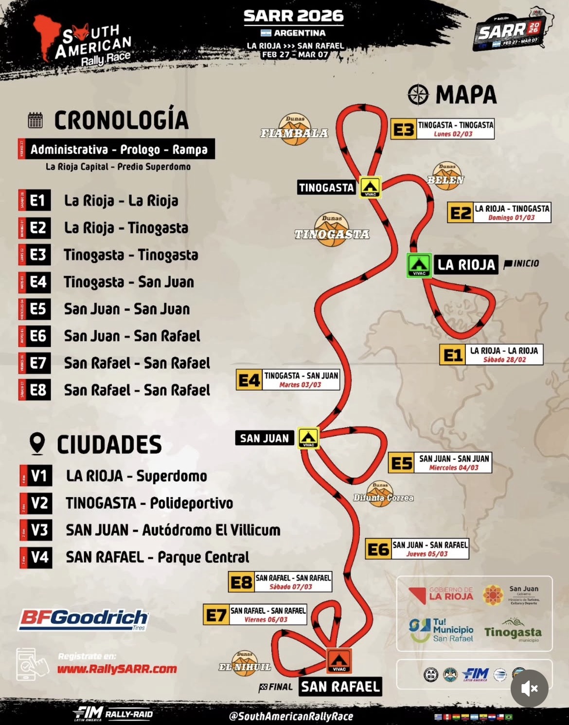 Estuvimos en contacto con el jefe de prensa, medios y redes del South American Rally Race, Juan Francisco Crifó, quien nos contó que la competencia comenzará el próximo 27 de febrero en la provincia de La Rioja y finalizará el 7 de marzo en San Rafael, Mendoza, luego de recorrer aproximadamente 3.500 kilómetros entre tramos de enlace y especiales a lo largo de distintas provincias argentinas.