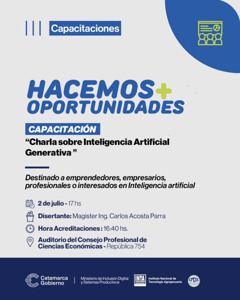 El Ministerio de Inclusión Digital y Sistemas Productivos invita a participar en la charla sobre Inteligencia Artificial Generativa que se llevará a cabo el 2 de julio en el Auditorio del Consejo Profesional de Ciencias Económicas, ubicado en República 754. Este evento, dirigido por el Ing. Carlos Acosta Parra, ofrecerá una visión transformadora sobre las aplicaciones de la IA generativa en entornos profesionales y empresariales.