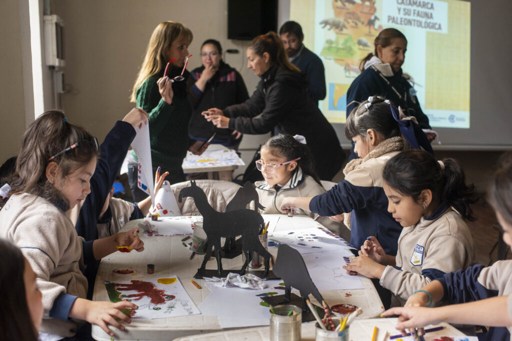 Un punto sobresaliente del taller fue la introducción a la mega fauna hallada en Catamarca, donde los estudiantes aprendieron cómo a partir de restos fósiles se puede reconstruir y comprender cómo eran estos animales gigantes, su dieta y su estilo de vida. Los niños participaron activamente armando rompecabezas, dibujando y pintando mega animales, a los cuales luego les aplicaron sellos con pinturas para darles textura.