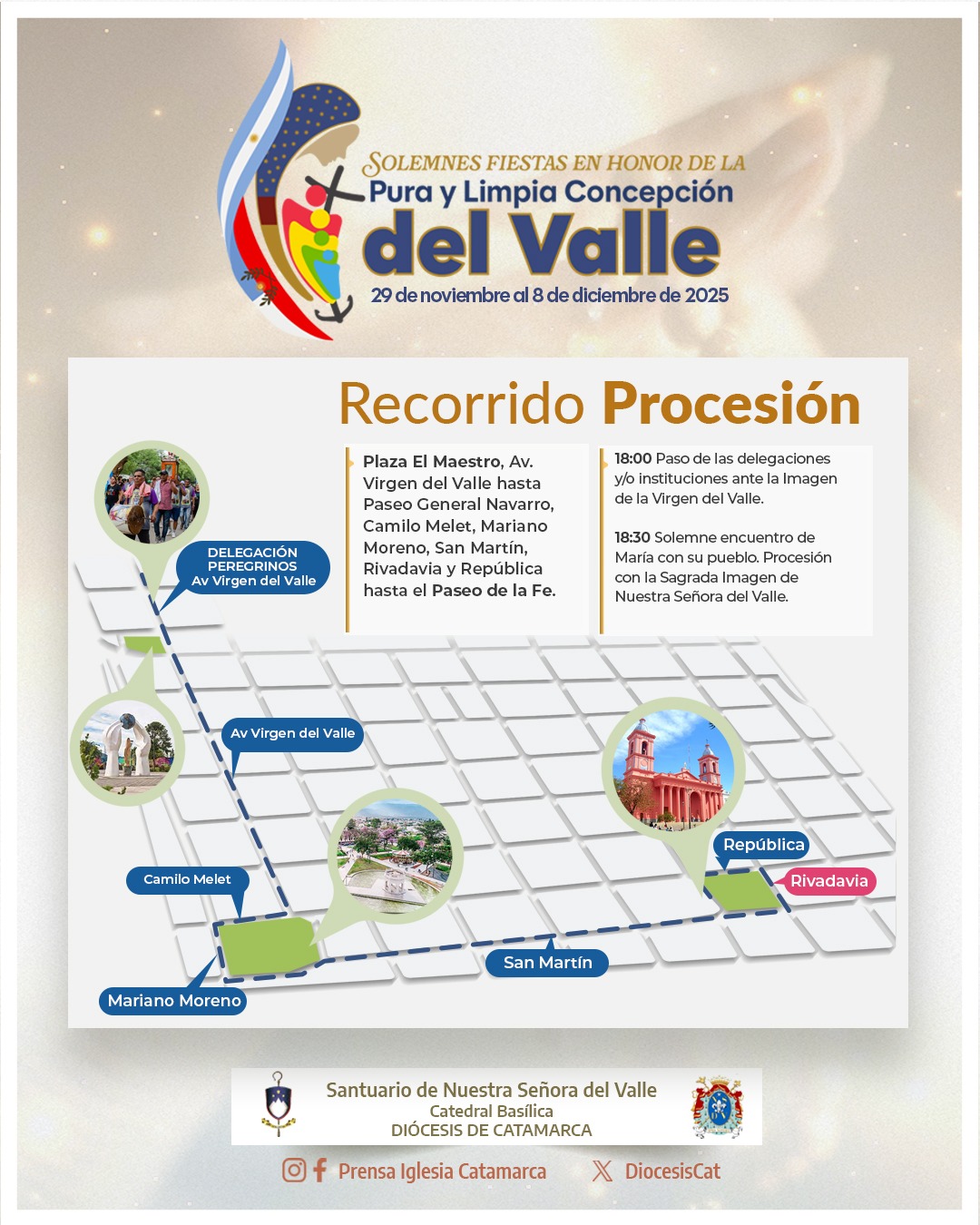 A las 18.30 se comenzará el desplazamiento de la Imagen de Nuestra Señora del Valle en la Solemne Procesión, cuyo recorrido comprenderá avenida Virgen del Valle hacia el sur hasta el Paseo General Navarro o La Alameda, continuando por Camilo Melet, Mariano Moreno, San Martín, Rivadavia y República hasta el Paseo de la Fe.