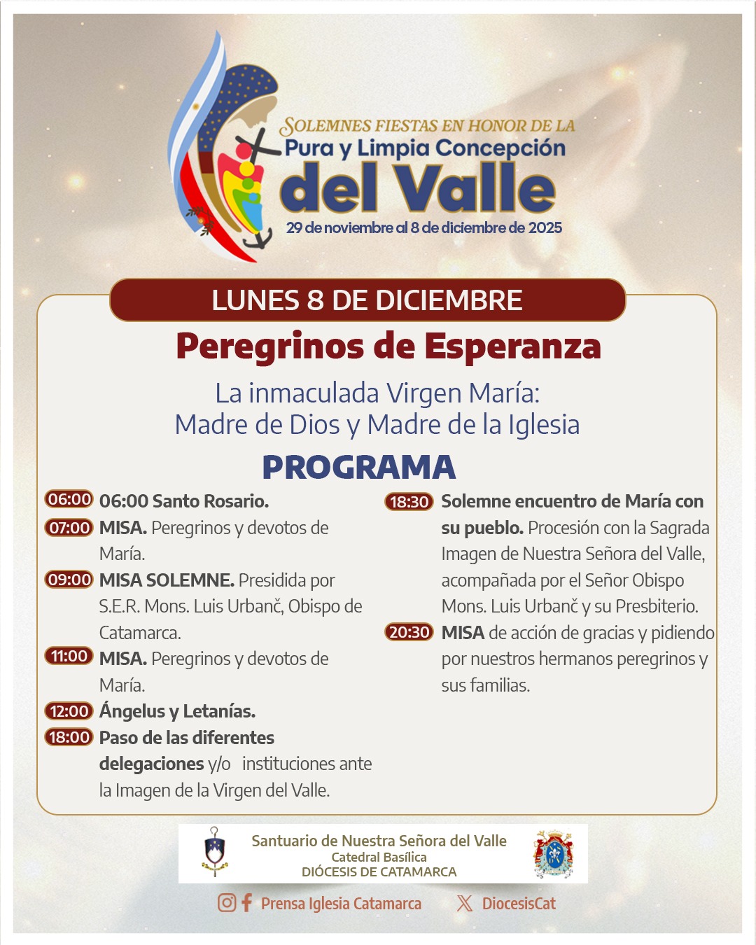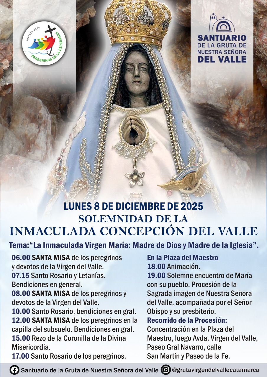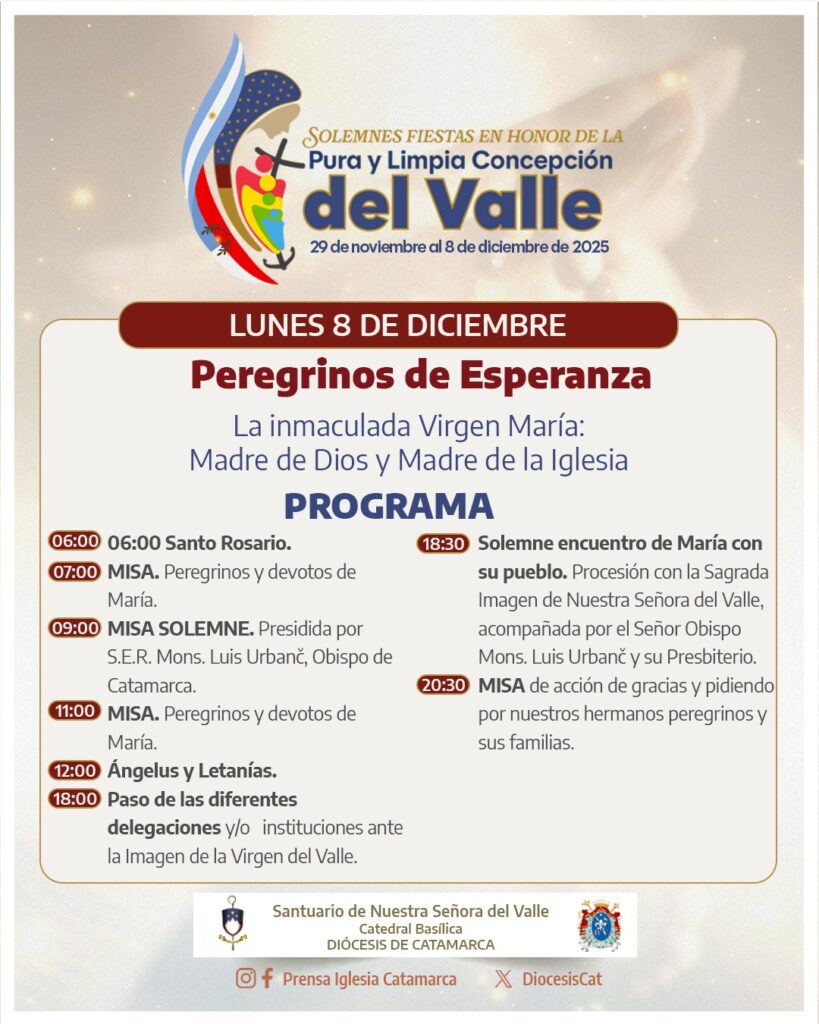 Este lunes 8 de diciembre, se llevarán a cabo los actos de cierre de las fiestas en honor de la Pura y Limpia Concepción del Valle, en el marco del Año Jubilar y bajo el lema “Peregrinos de esperanza”.