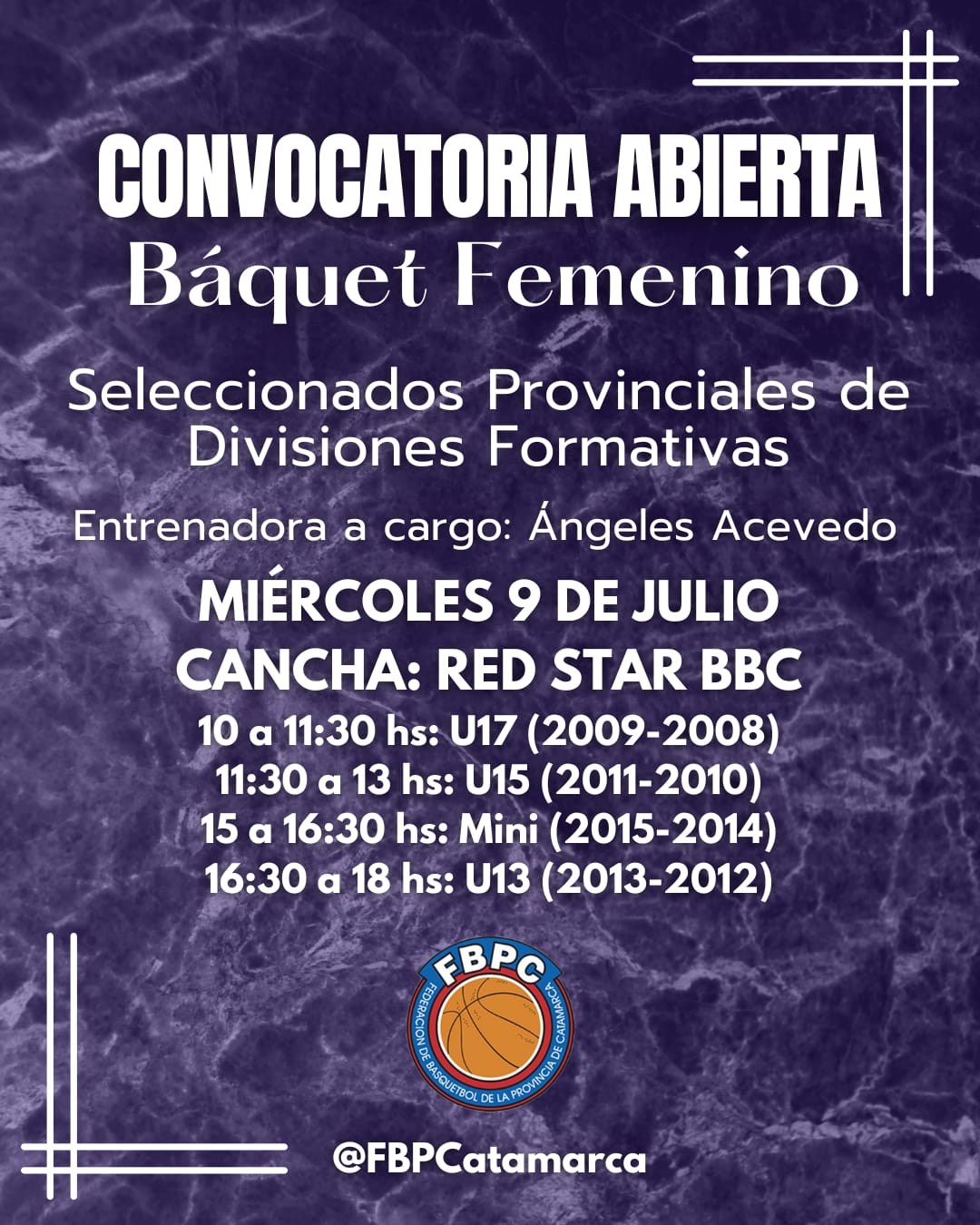 Este miércoles 9 de julio, en la cancha de Red Star BBC, la Federación de Básquetbol de la Provincia de Catamarca a través de su Departamento de Básquet Femenino realizará una convocatoria abierta de jugadoras de toda la provincia para la conformación de los seleccionados provinciales en Divisiones Formativas.