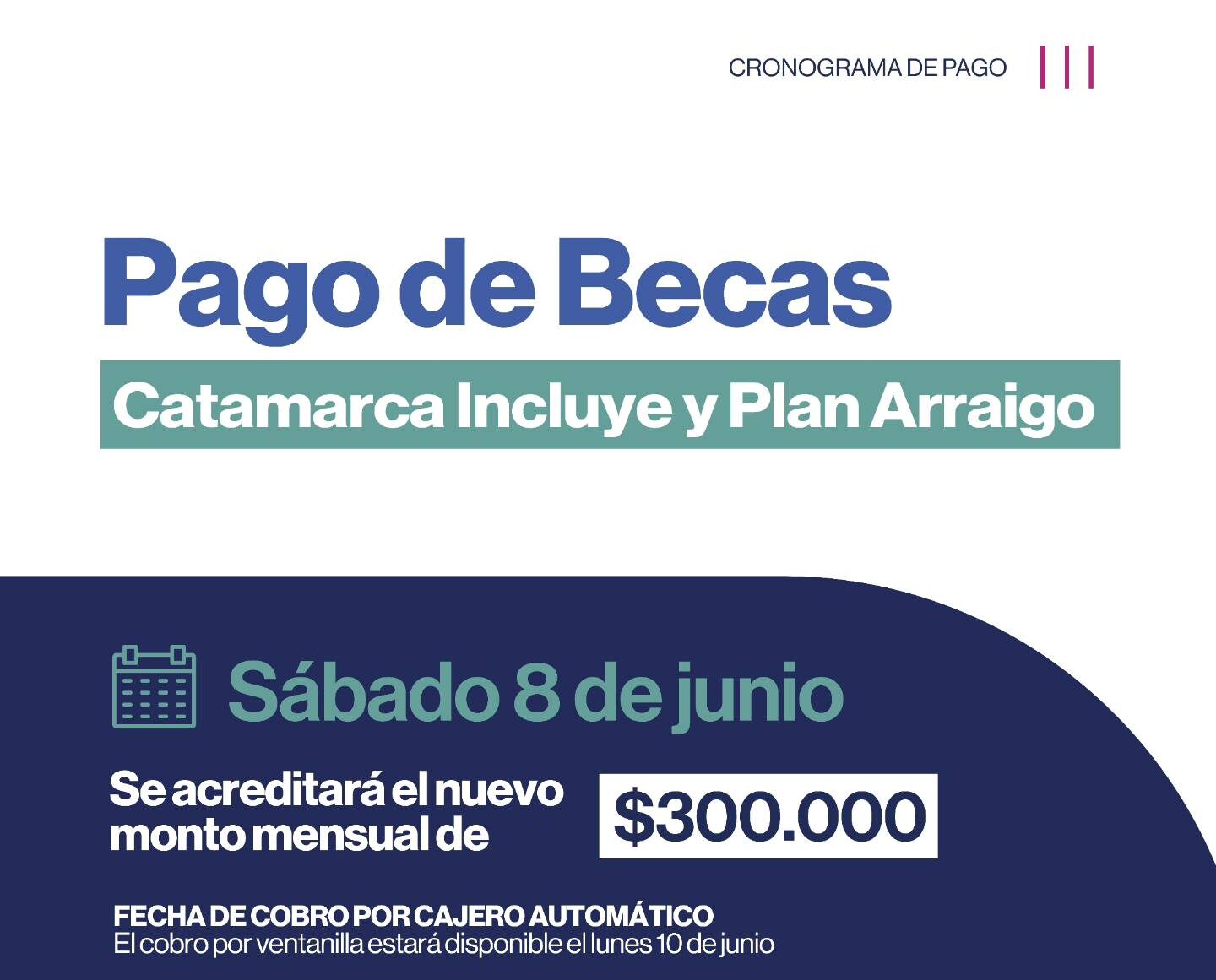El Ministerio de Trabajo, Planificación y Recursos Humanos informa a los beneficiarios de las becas «Catamarca Incluye» y “Plan Arraigo” que se estableció el cronograma de pagos, quedando establecido de la siguiente manera: