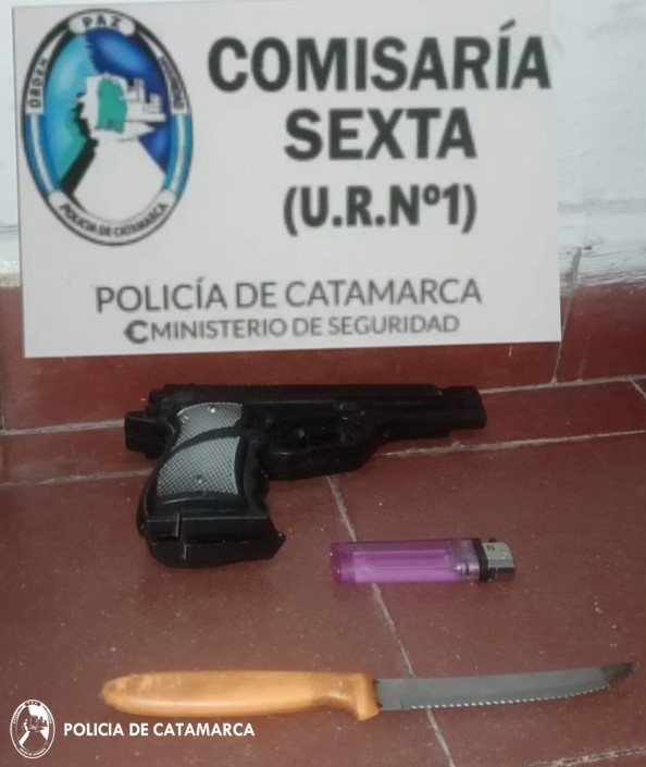 Seguidamente y en las inmediaciones, los uniformados procedieron a la demora del presunto autor, un adolescente de 16 años de edad, como así también secuestraron una réplica de arma de fuego y el arma blanca.