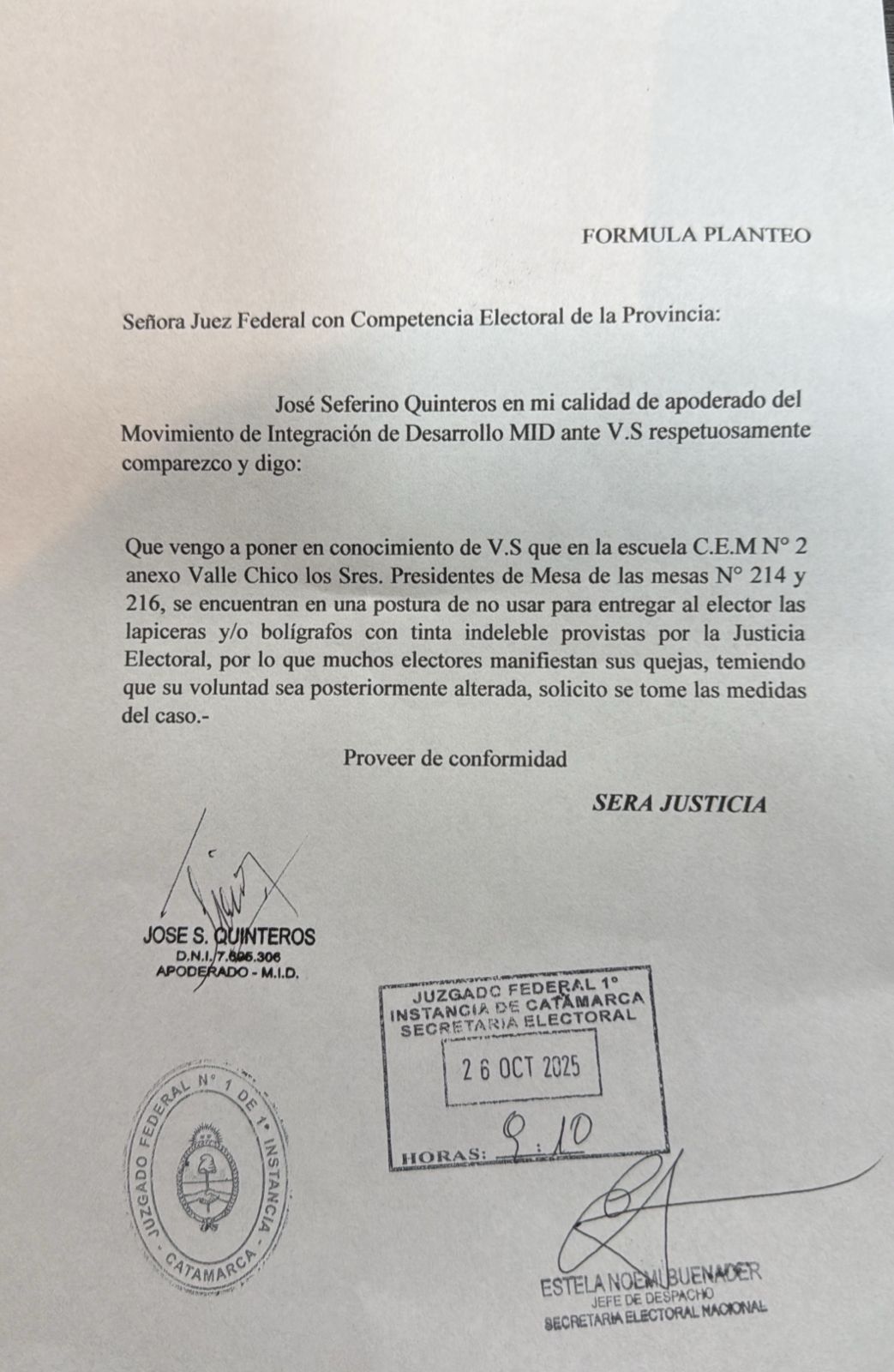 Según el escrito ingresado al tribunal, Quinteros informó que los presidentes de las mesas Nº 214 y 216 habrían adoptado la decisión de no utilizar las lapiceras o bolígrafos con tinta indeleble provistos por la Justicia Electoral para el acto de votación.