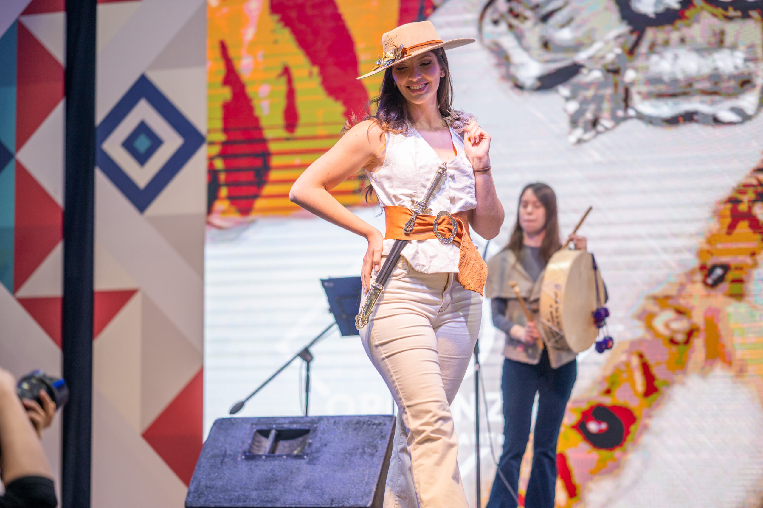 La noche del domingo la pasarela se transformó en una celebración de lo local, con piezas que combinaron confección textil, orfebrería tradicional y una estética centrada en el territorio. La colección incluyó textiles intervenidos con tintes naturales, bordados artesanales y géneros que representan paisajes y tradiciones autóctonas.