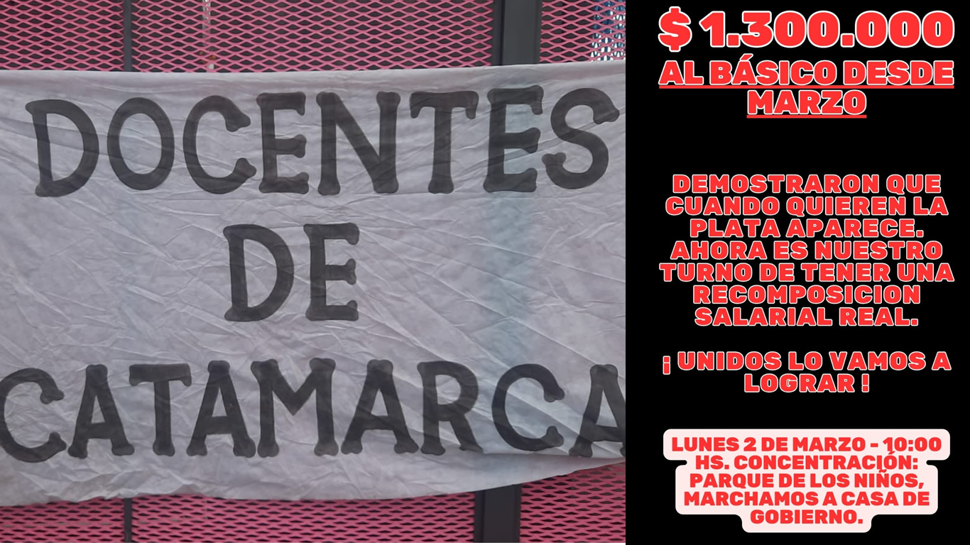 Bajo la consigna “¡Docentes de Catamarca, el momento es ahora!”, un sector de la docencia provincial lanzó una convocatoria a movilizarse el próximo lunes 2 de marzo a las 10 horas, con concentración en el Parque de los Niños y posterior marcha hacia la Casa de Gobierno de Catamarca.