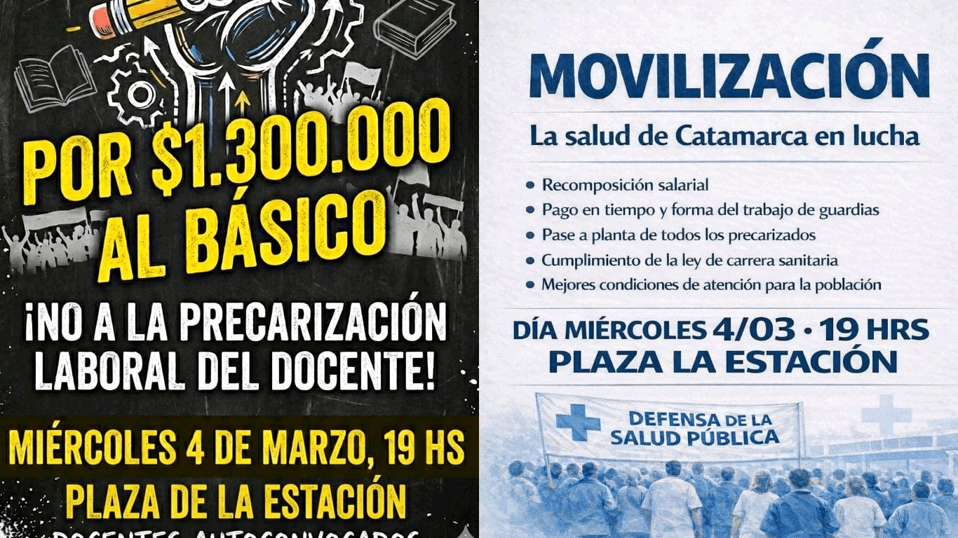 En paralelo, trabajadores de la salud autoconvocados también marcharán este miércoles bajo el lema “La salud de Catamarca en lucha”. La concentración está prevista para las 19 horas en Plaza La Estación. Entre los principales reclamos figuran la recomposición salarial, el pago en tiempo y forma de guardias, el pase a planta permanente de personal precarizado y el cumplimiento efectivo de la ley de carrera sanitaria.