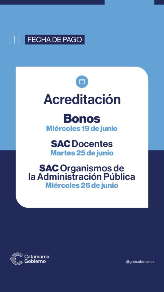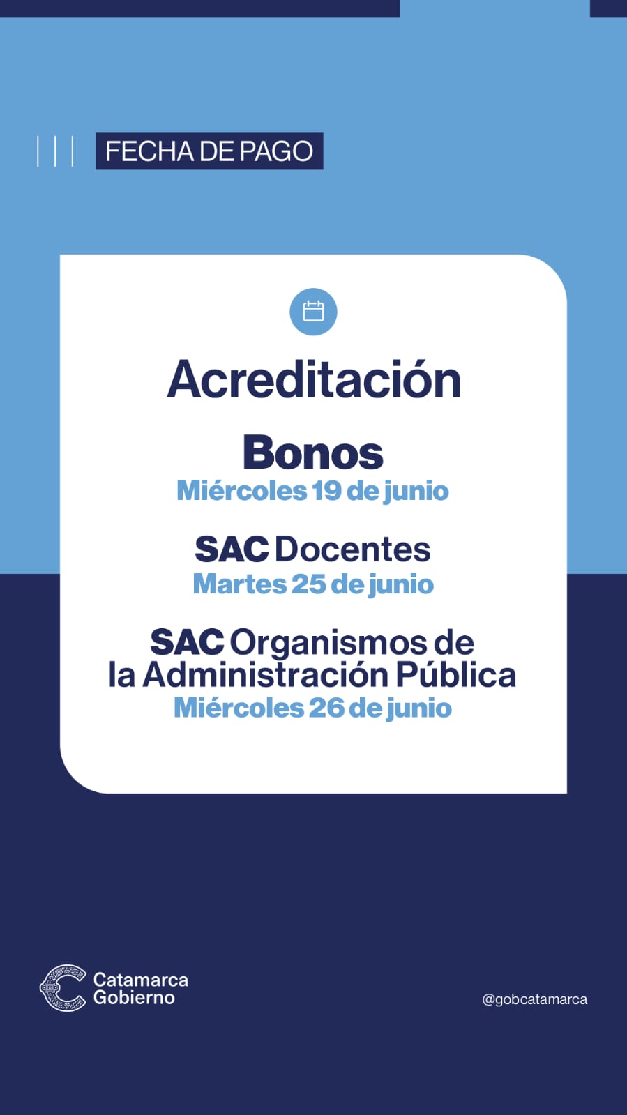 El Ministerio de Economía informa que los diferentes bonos extraordinarios anunciados para el mes de junio serán acreditados el próximo miércoles 19. En tanto, el medio aguinaldo del Sueldo Anual Complementario (SAC) será desdoblado de la siguiente manera: