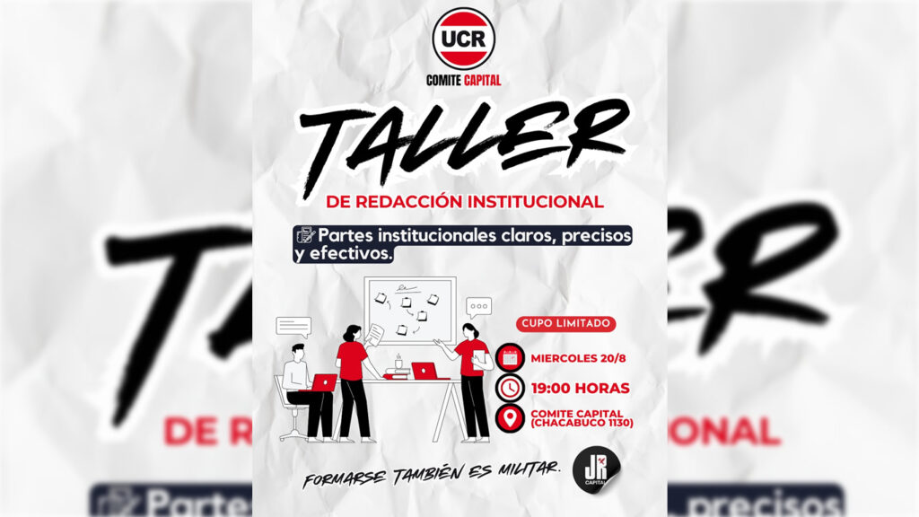 En el marco de su compromiso con la formación y la comunicación política, el Comité Capital de la Unión Cívica Radical (UCR) llevará a cabo el miércoles 20 de agosto, a las 19 hs, un taller de Redacción Institucional destinado a militantes, comunicadores y público en general.