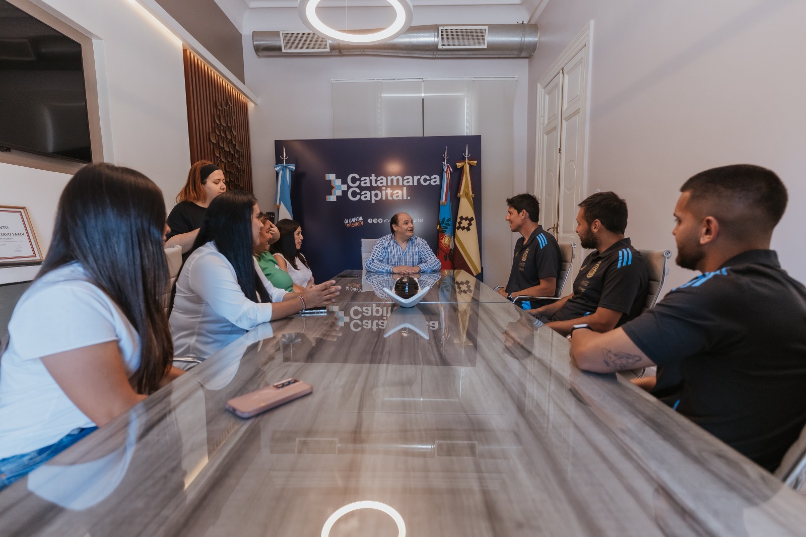 Acompañaron al jefe comunal en la reunión, Nicolás Valado, analista de videos, y Franco Caponetto, preparador físico. También estuvo presente la presidenta de la Liga Catamarqueña de Fútbol, Sylvia Jiménez, entre otras autoridades.