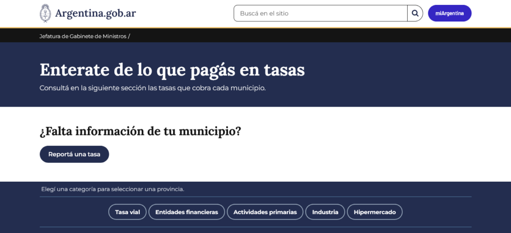 El Gobierno habilitó un sitio web Transparencia Tributaria Municipal para consultar y denunciar el aumento de tasas en todas las comunas del país. La inciativa fue comunicada por el jefe de Gabinete y vocero presidencial, Manuel Adorni, a través de sus redes sociales. «Que nadie se quede con lo que es tuyo», incitó a los ciudadanos a ser parte de la iniciativa del Gobierno.