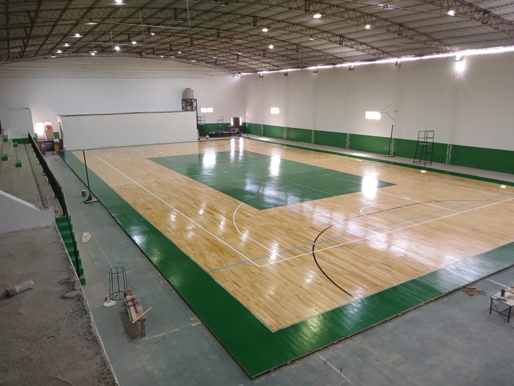 -Club Hindú: Ejecución de baños, tableros, service piso deportivo flotante, cerramiento de laterales, pintura, reparación ingreso principal, vestuarios, nueva tribuna metálica e iluminación.
