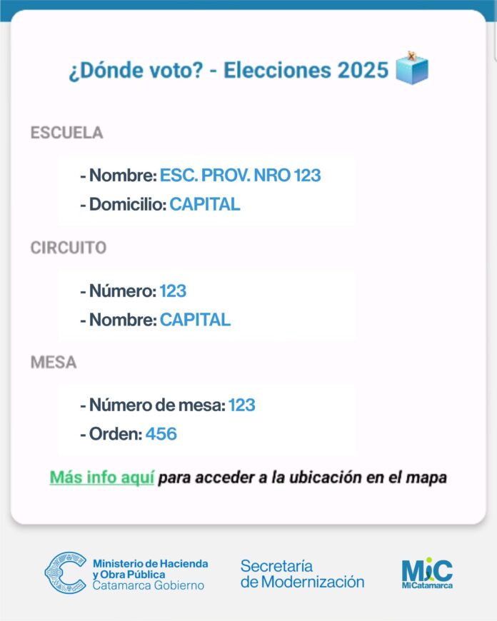 A partir de hoy los ciudadanos catamarqueños en condiciones de emitir su voto en los comicios legislativos del próximo domingo 26 de octubre pueden consultar el lugar de emisión del voto en la app Mi Catamarca y en el Portal oficial del Gobierno de Catamarca https://portal.catamarca.gob.ar/paginas/elecciones-legislativas-2025-503.