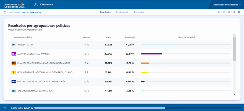 Con los resultados provisorios, el oficialismo obtiene 11 de las 21 bancas en juego. La Libertad Avanza suma 6, mientras que Somos Provincias Unidas Catamarca y el MID logran 2 escaños cada uno.