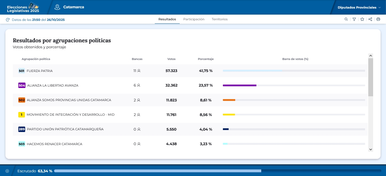Con los resultados provisorios, el oficialismo obtiene 11 de las 21 bancas en juego. La Libertad Avanza suma 6, mientras que Somos Provincias Unidas Catamarca y el MID logran 2 escaños cada uno.
