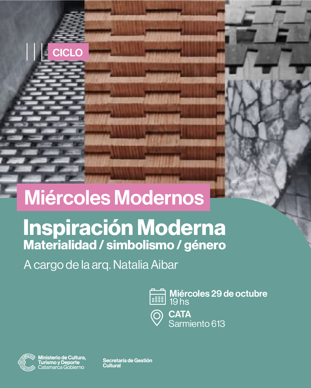 Este miércoles 29 de octubre, el ciclo Miércoles Modernos presenta la charla “Inspiración moderna – materialidad / simbolismo / género”, a cargo de la arquitecta María Natalia Aibar, una invitación a reflexionar sobre la arquitectura moderna como una forma de pensamiento en transformación. Será a las 19 horas en CATA, Sarmiento 613.