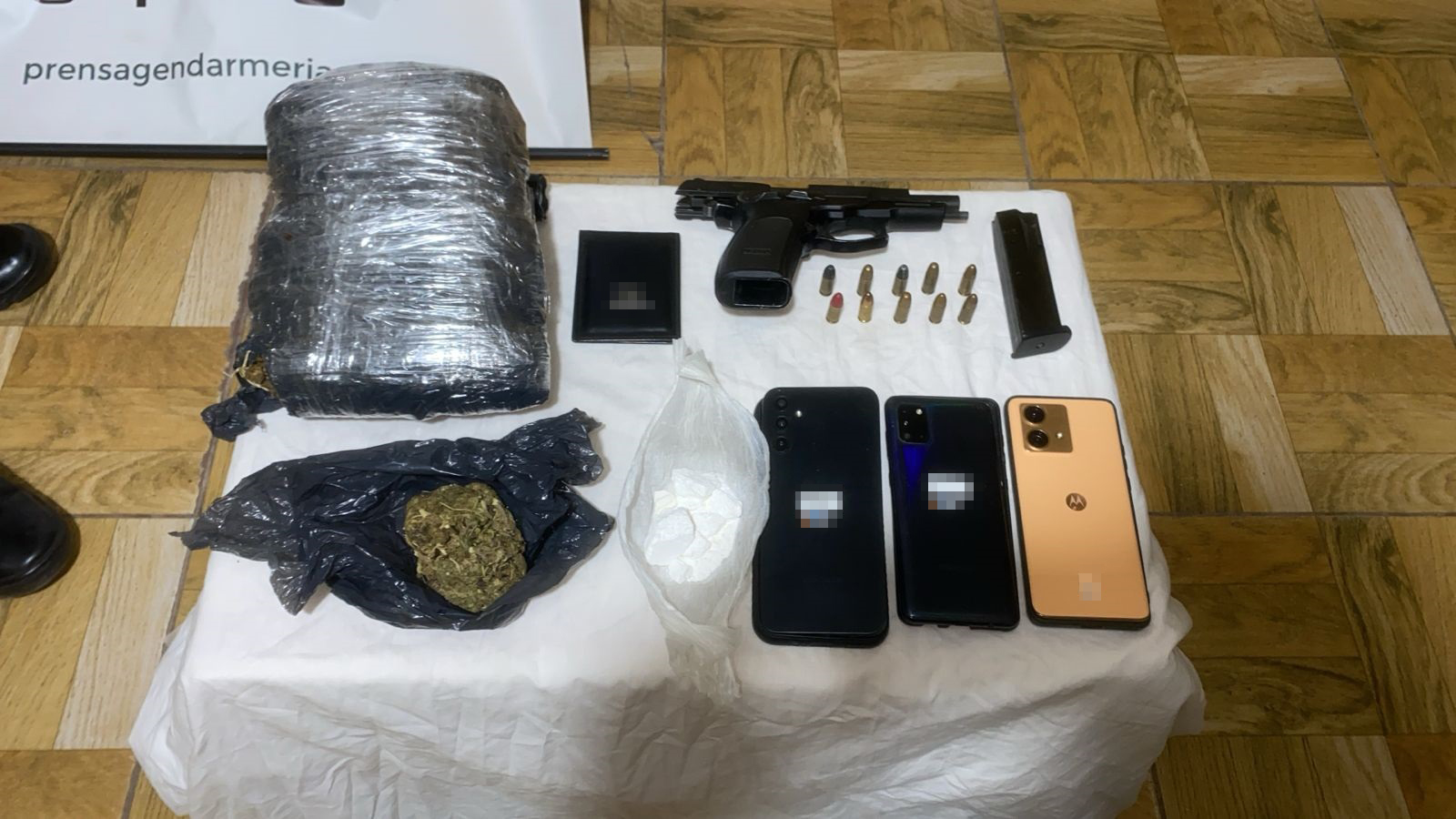 En un segundo procedimiento, otros dos ciudadanos fueron aprehendidos al momento de transportar 1 kilo 52 gramos de marihuana, 38 gramos de cocaína, un arma y municiones.