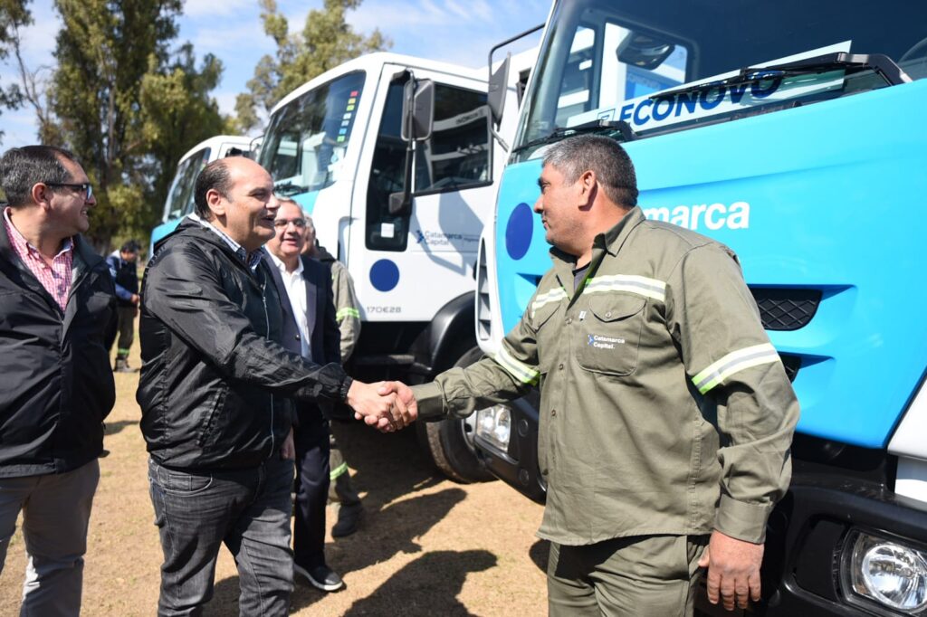 El intendente de la Capital, Gustavo Saadi acompañado por el gobernador de la Provincia, Raúl Jalil realizaron la entrega de ocho camiones cero kilómetros que serán destinados a la recolección de residuos en la ciudad, y un camión regador que se incorporará al área de Medio Ambiente.