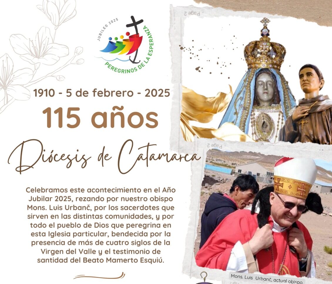 Celebramos este acontecimiento con mucha alegría y rezando por nuestro padre obispo Mons. Luis Urbanč, por los sacerdotes que sirven en las distintas comunidades y por todo el pueblo de Dios que peregrina en esta Iglesia particular, bendecida por la presencia de más de cuatro siglos de Nuestra Señora del Valle y el testimonio de santidad del Beato Mamerto Esquiú. También oramos por todos los obispos que la condujeron pastoralmente: Mons. Bernabé Piedrabuena, Mons. Inocencio Dávila y Matos, Mons. Vicente Peira, Mons. Carlos Hanlon, Mons. Adolfo Tortolo, Mons. Pedro Alfonso Torres Farías y Mons. Elmer Osmar Miani.