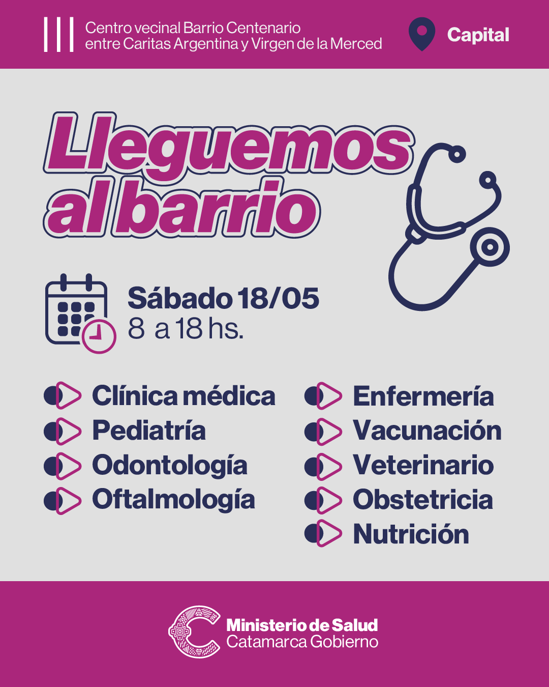 El Ministerio de Salud de la Provincia, a través del Programa Lleguemos al Barrio, brindará asistencia el sábado 18 de mayo en el Centro Vecinal Barrio Centenario, que se encuentra ubicado en calle Presbítero Licenciado Ángel Villagrán entre Caritas Argentina y Virgen de la Merced, de 8 a 18 horas.