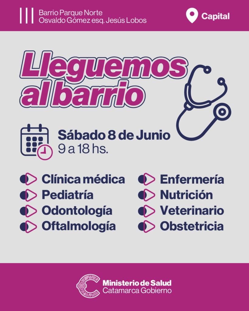 El Ministerio de Salud de la Provincia, a través del Programa Lleguemos al Barrio, brindará asistencia el sábado 8 de junio en las calles Osvaldo Gómez esquina Jesús Lobos en el Barrio Parque Norte en el horario de 9 a 18 horas.
