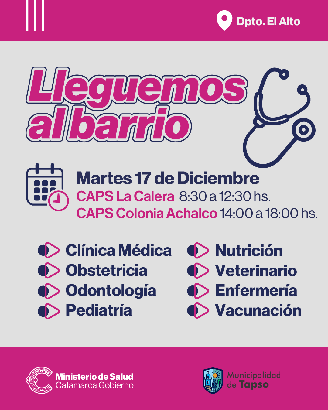 El Ministerio de Salud, a través del Programa Lleguemos al Barrio, brindará asistencia el martes 17 de diciembre en las localidades de La Calera y Colonia de Achalco, departamento El Alto.