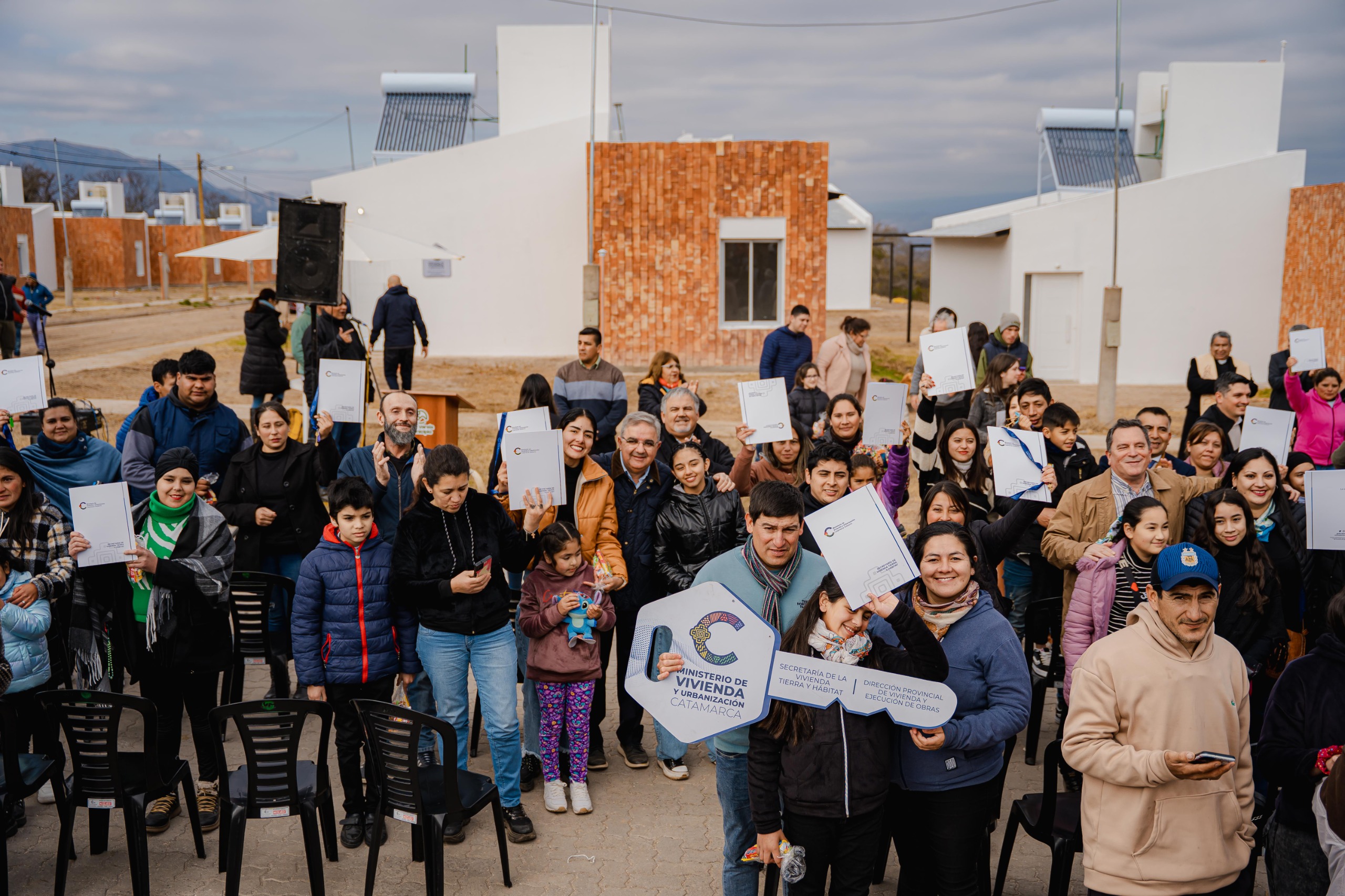 Este sábado, en el marco de los festejos por el 156° aniversario de la creación del Departamento Ambato, el gobernador Raúl Jalil, acompañado por el ministro de Vivienda y Urbanización, Fidel Sáenz, y el intendente de Los Varela, Patricio Villafañez, hicieron entrega de 38 viviendas a familias de la localidad de Los Castillos.