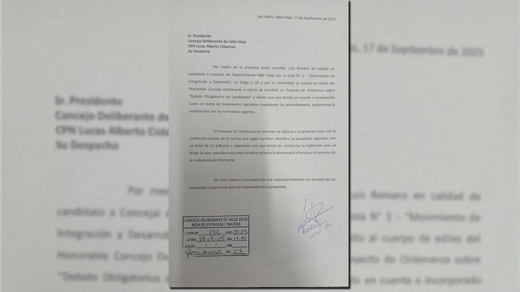 En la jornada de hoy, el candidato a concejal de Valle Viejo por la Lista N°1 – MID, Luis Romero, presentó formalmente un pedido al cuerpo de concejales para que se concrete un debate entre los postulantes que competirán en las próximas elecciones municipales.