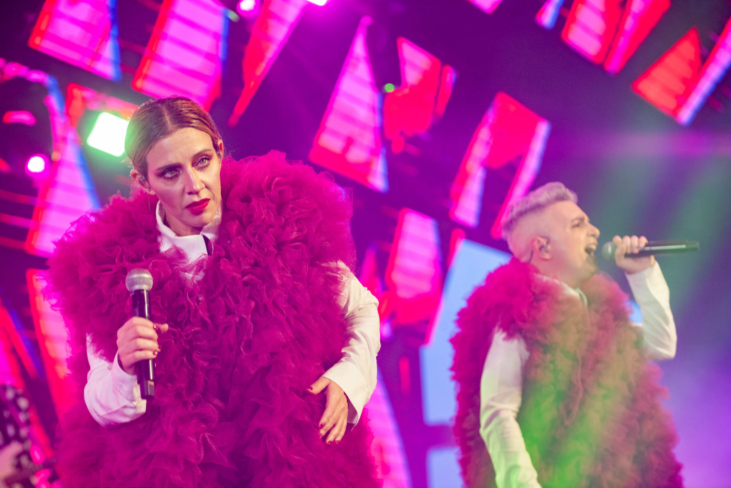 Los recientes ganadores del Gardel de Oro llegaron al escenario con lentes oscuros y un look elegante: camisas blancas, corbatas y sacos negros con brillos y detalles rojos e hicieron varios cambios de vestuario a lo largo de la noche. Ovación y explosión musical. Así la noche continuó con “Luna de papel”, “Lo que siento por ti”, y “Uno los dos”, entre otros. Un show pocas veces visto. Daba la impresión que se trataba de una discoteca gigante que se movilizaba al ritmo de las icónicas melodías que entregaban a cada paso Ale y Juliana, conjugadas con un gran despliegue visual.