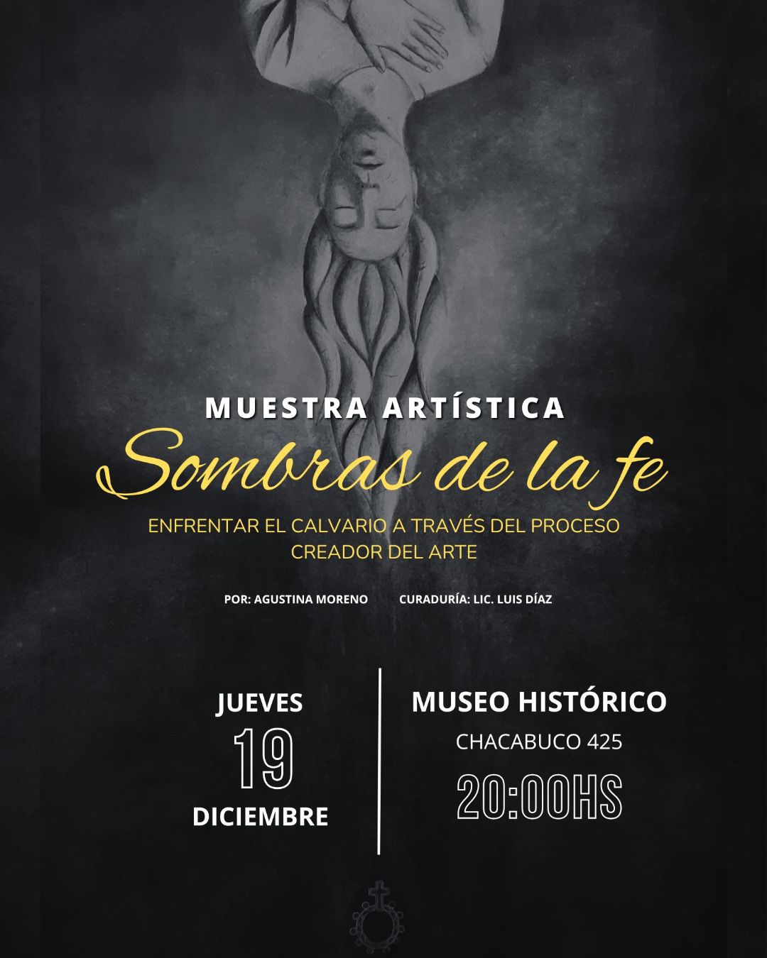 El próximo jueves 19 de diciembre a las 20 hs inaugura la muestra artística “Sombras de la fe, enfrentar al calvario a través del proceso creador del arte”, de la artista visual Agustina Moreno. La cita es en el Museo Histórico de la provincia, ubicado en Chacabuco 425.