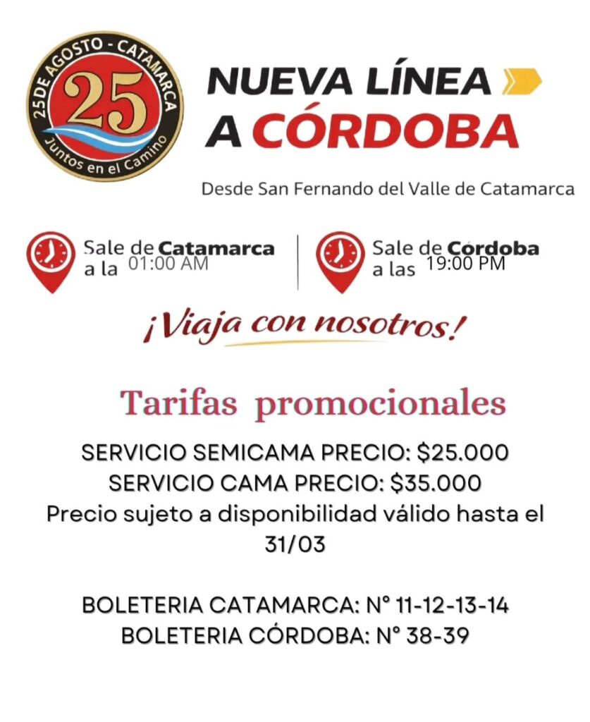 La empresa de transporte 25 de Agosto confirmó la incorporación de un nuevo recorrido de carácter nacional que enlazará la provincia de Catamarca con Córdoba. El servicio comenzará a operar el próximo 2 de marzo, ampliando las opciones de traslado entre ambas jurisdicciones.