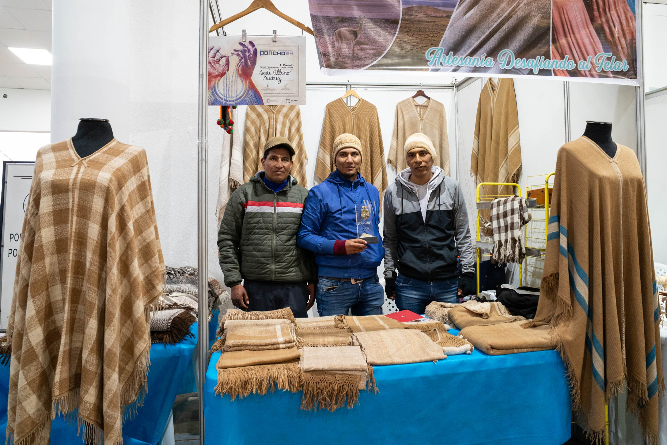 Los hermanos José, Saúl y Jaime Suárez, de Laguna Blanca, tejen desde chicos, y en todas las generaciones de su familia todos lo hacen. “Nuestras abuelas, nuestra madre, mi hijo Jeremías de 17 años y mi hija Macarena de 14 años saben hilar y tejer, los más chicos de 6 y 8 años ya quieren ovillar, y el año pasado ganó como mejor poncho de vicuña mi esposa y este año mi hermano Saúl”, contó orgulloso José.