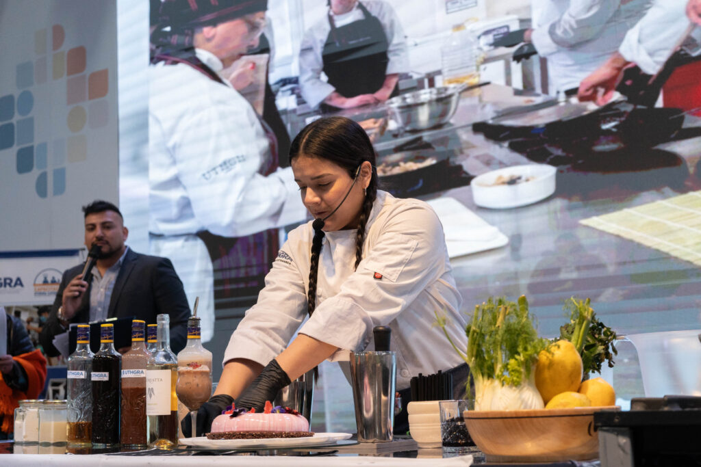 Los chefs locales Fernanda Aybar y Bruno Agüero de la escuela de Uthgra Catamarca elaboraron en vivo diferentes opciones gastronómicas de cocina, pastelería y coctelería adaptadas con productos regionales. El menú presentado por los chef catamarqueños consistió en croqueta de gallina con corazón de queso picante, dip de puerro asado y torta espejo con velo de hibiscus, una experiencia de sabores intensos y colores exquisitos.
