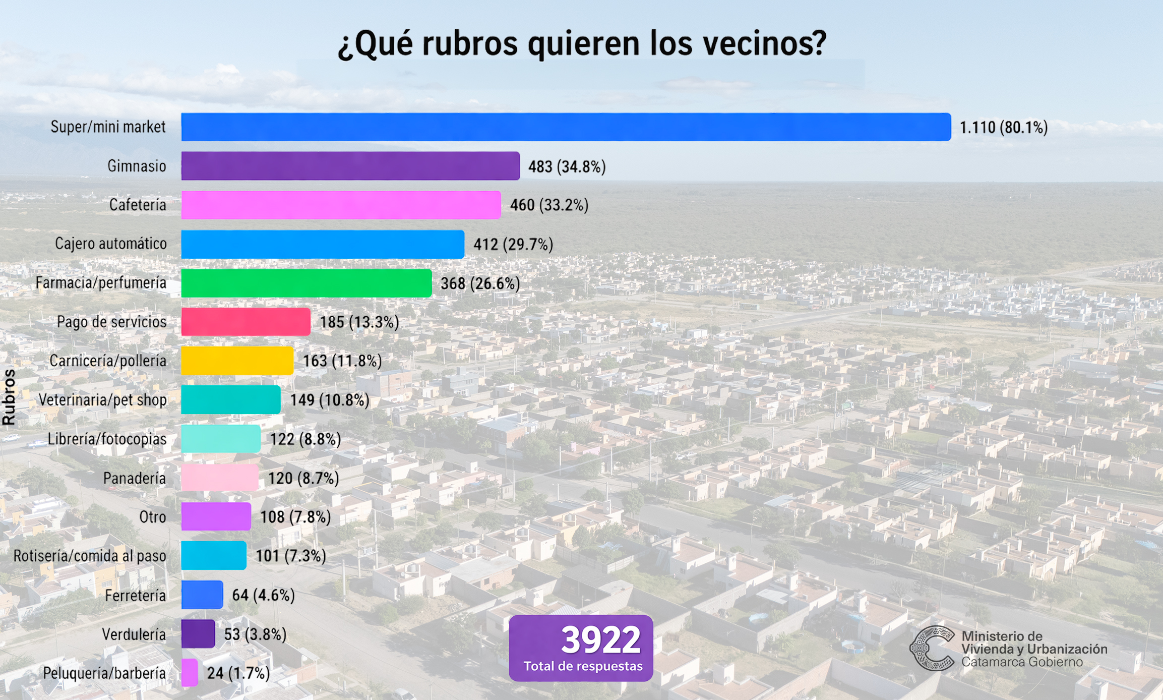 Entre las principales preferencias, se destaca ampliamente la opción de supermercado o minimarket, que concentró el 80,1% de las respuestas, posicionándose como la necesidad más importante para el barrio.