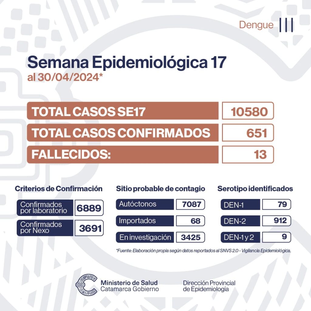 El Ministerio de Salud informa que durante la Semana Epidemiológica 17, del 22 al 28 de abril de 2024, se registraron 651 nuevos casos de Dengue y 1 deceso por Dengue.