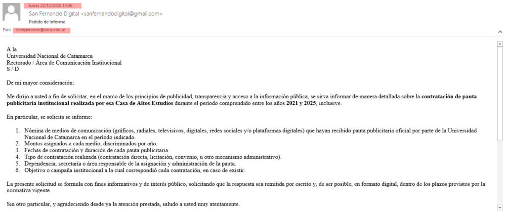 El primer pedido fue enviado el 22 de diciembre de 2025 vía correo electrónico al Responsable de Acceso a la Información Pública. Allí se requirió, de manera detallada, información sobre la contratación de pauta publicitaria institucional realizada por la Casa de Altos Estudios durante el período 2021–2025, incluyendo un desglose específico por ítems. El segundo pedido fue cursado el 5 de febrero de 2026. En ninguno de los dos casos hubo respuesta, notificación de prórroga ni acto administrativo que justificara una eventual negativa.
