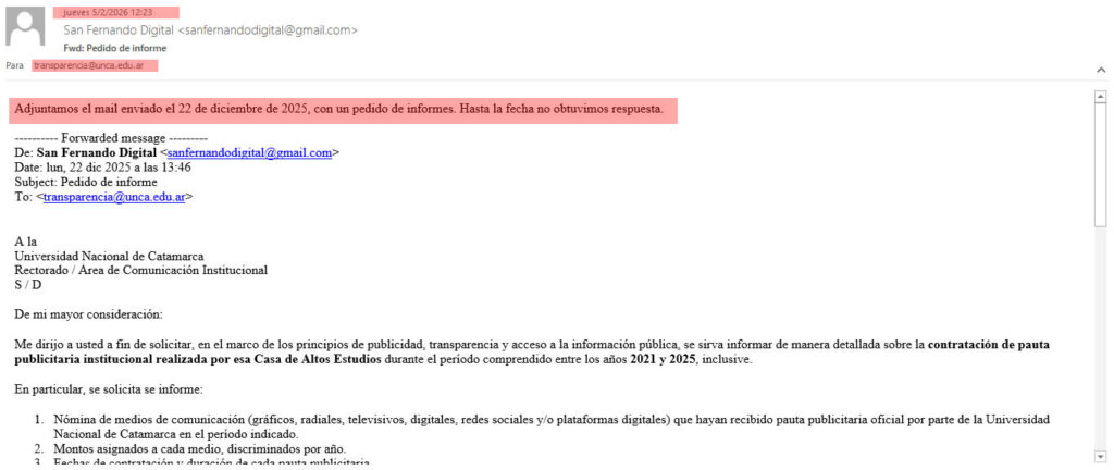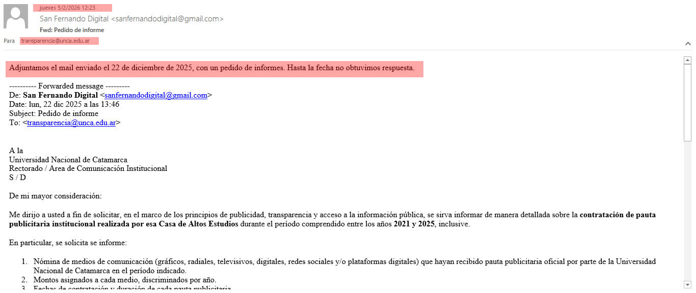 San Fernando Digital realizó dos pedidos, por vías habilitadas y conforme a los requisitos establecidos. La ausencia de respuesta no es un detalle administrativo: es, jurídicamente, una denegatoria injustificada y, políticamente, una señal preocupante sobre el estado real de la transparencia en la Universidad Nacional de Catamarca.