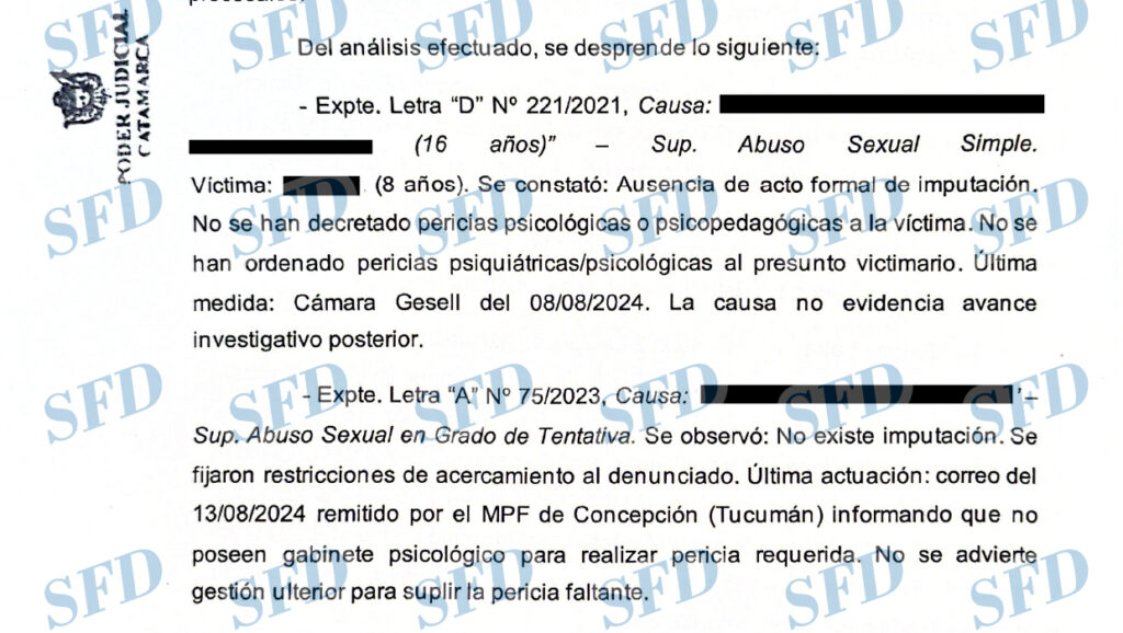 Situación similar se detectó en el Expte. “D” Nº 221/2021, donde tampoco existe acto formal de imputación ni pericias ordenadas a la víctima ni al presunto autor. La última medida data de agosto de 2024, sin avances posteriores.