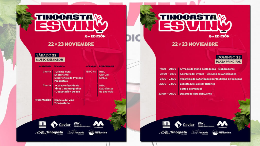 La propuesta reunirá a productores, bodegas, especialistas y visitantes que podrán disfrutar de dos jornadas colmadas de actividades pensadas para celebrar la identidad vitivinícola local. El programa incluye charlas de turismo rural, enoturismo, experiencias sobre el proceso productivo, exposiciones sobre la caracterización de los vinos catamarqueños, además de degustaciones guiadas y un espacio exclusivo para destacar la calidad del vino tinogasteño.