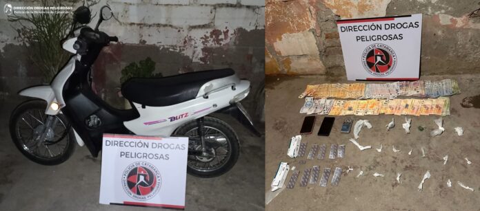 Tras irrumpir en las viviendas, los policías secuestraron envoltorios de plástico con sustancias tipo polvo blanco y herbácea, que al ser sometidos a la prueba de campo correspondiente, arrojó como resultado que se tratarían de Cocaína y Marihuana respectivamente, como así también incautaron cien (100) comprimidos de Midazolam de 15 ml., una (01) balanza de precisión, dos (02) teléfonos celulares de diferentes marcas y modelos, una (01) motocicleta Motomel Blitz blanca y la suma de cuatrocientos setenta y tres mil setecientos cincuenta pesos ($473.750) en efectivo.