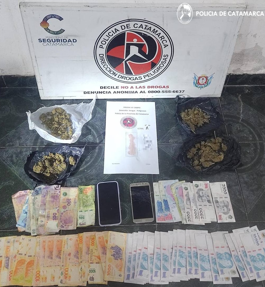 En la misma se encontraron envoltorios de plástico con sustancia vegetal, que al ser sometida a la prueba de campo correspondiente arrojó resultado positivo para probable marihuana, acusando un peso de 102 gramos, que quedaron en calidad de secuestro, al igual que la suma de doscientos sesenta y ocho mil seiscientos ($268.600) pesos en efectivo, discriminados en billetes de distinta denominación, dos (02) teléfonos celulares y una (01) motocicleta Honda Wave 110 cc.