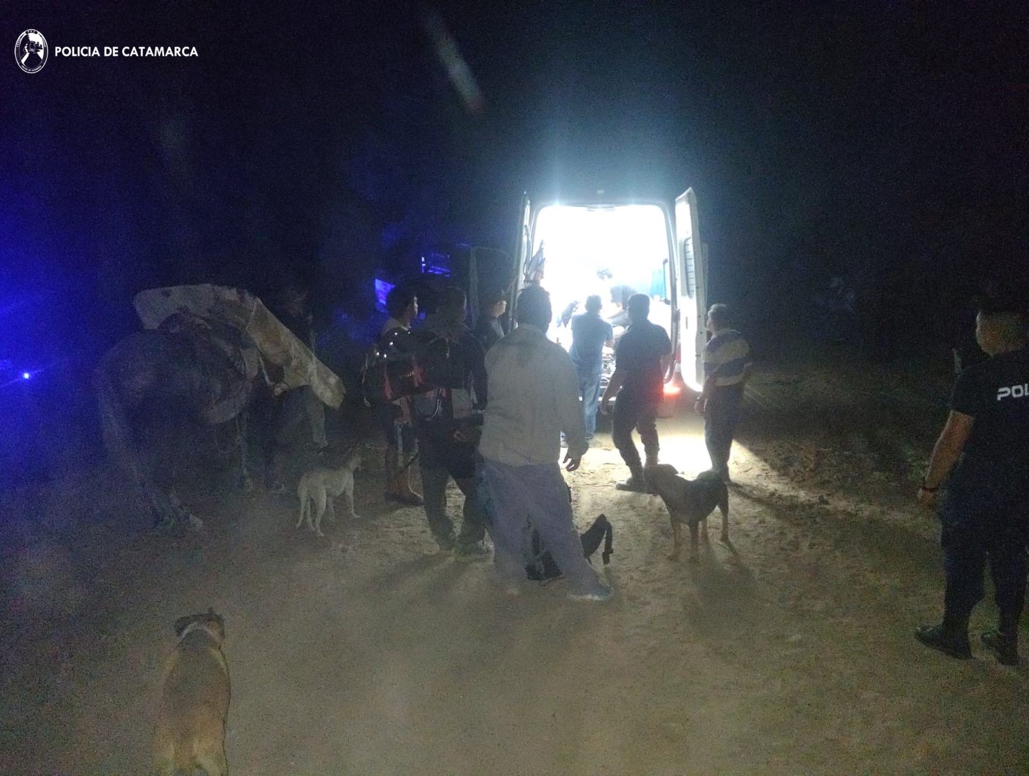 Luego de descender, a las 21:20, el personal policial dio intervención a facultativos médicos del Hospital de Saujil, quienes brindaron la asistencia correspondiente a las dos personas que felizmente pudieron ser rescatadas.