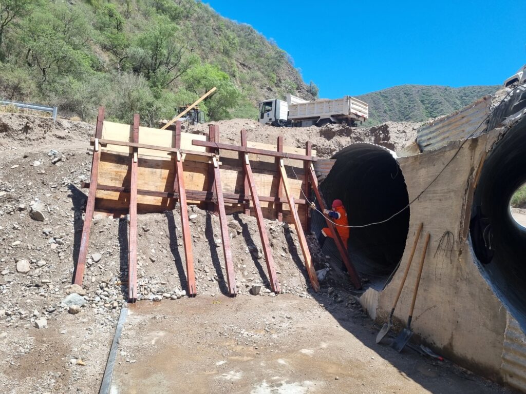 Actualmente se está concluyendo el armado del encofrado, lo que permitirá construir las cabeceras de hormigón, estructura vital para proteger la alcantarilla ante futuras crecidas del río que atraviesa La Cébila.